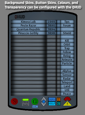 * Cor HUD configurável e pele capaz, portanto, você pode personalizar a aparência de suas preferências.Você tem o controle total sobre o fundo, botões, cores e transparência para fazer a sua QHUD olhar o jeito que você quiser.o 16 milhões de coresníveis de transparência o Mulipleaparência do botão Custom oPersonalizar o fundo (pele)Personalizar o Shield / cores efeitos de partículas para corresponder ao seu HUD* Minimizar o HUD quando não está sendo usado.minimizar o Real! O QHUD fica totalmente fora do seu caminho sem deixar para trás qualquer prims anoying invisível toda a tela para bloquear suas interações com os objetos no mundo.Enquanto o minimizado você só verá uma pequena QHUD Logo, Lag metros, e os botões Radar / Safe alternar na tela. O espaço combinado é que eles ocupam o mesmo que controla o visualizador de mídia. (Ou seja, quase nada!)